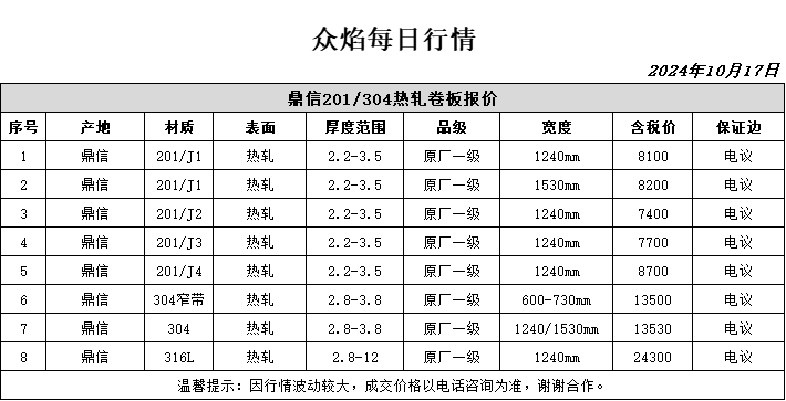 眾焰每日行情2024年11月18日鼎信201/304熱軋卷板報價(jià)序號產(chǎn)地材質(zhì)表面厚度范圍品級寬度含稅價(jià)保證邊1鼎信201/J1熱軋2.2-3.5原廠(chǎng)一級1240mm8500電議2鼎信201/J1熱軋2···